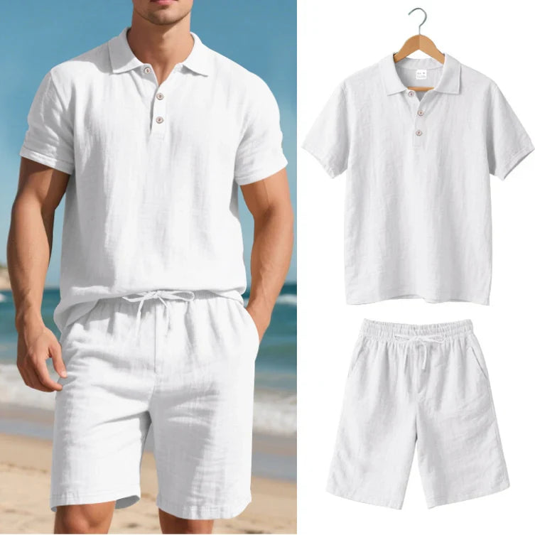 Experience relaxed elegance for warm days with the Achille set, which combines classic summer style with modern comfort. This two-piece design features a lightweight woven polo shirt and matching shorts made from a soft and breathable linen blend. The relaxed fit allows for freedom of movement while maintaining a clean and stylish appearance, making it ideal for vacations, city life, and everyday wear.